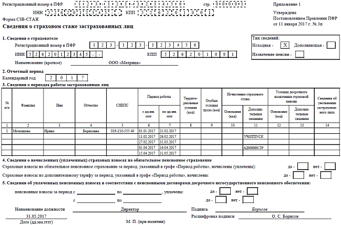 Форма СЗВ-СТАЖ «Сведения о страховом стаже застрахованных лиц» и порядок ее заполнения утверждены Постановлением Правления ПФР от 11.01.2017 № 3п (далее – Порядок).