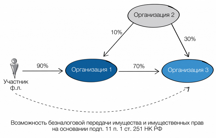 П.п.11 п.1 ст.251 НК РФ также дает возможность обратной передачи - от «дочки» к организации-участнику (акционеру), прямая и/или косвенная доля которой в уставном капитале не менее 50 %. Мы назвали это «дочерним подарком». Он может быть альтернативой выплате дивидендов, например, когда помимо мажоритарного участника с долей 50 % есть миноритарии, «распределять прибыль» в пользу которых не хочется: дивиденды распределяются в большинстве случаев пропорционально, а к «дочернему подарку» такое требование не предъявляется.