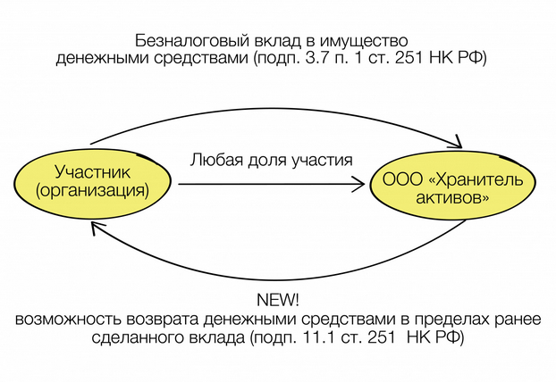 Вклад должен быть сделан и возвращен исключительно в денежной форме. Если первоначальные вклады в имущество Общества были осуществлены не деньгами, а иным имуществом (зданиями, земельными участками, оборудованием, долями (акциями) в уставном капитале Общества), то возвратить данные активы обратно внесшему их участнику без уплаты налога на основании положения пп. 11.1 п. 1 ст. 251 НК РФ не получится. Возврат вклада также должен быть осуществлен в денежной форме. Это исключает ситуации возможных злоупотреблений, связанных с несоразмерностью первоначального вклада и способа его безналогового возврата.