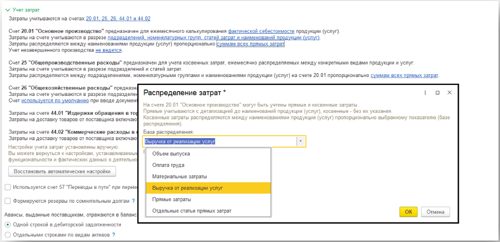 Раньше, если у организации не было затрат, которые могли формировать базу для распределения, но была выручка от реализации услуг, то косвенные затраты не распределялись. Сейчас добавлена возможность распределения косвенных затрат между наименованиями оказанных услуг пропорционально выручке от реализации услуг за отчетный месяц. Иными словами, косвенные затраты распределяются между номенклатурными группами, по которым в отчетном месяце есть выручка от реализации услуг, независимо от наличия прямых затрат.