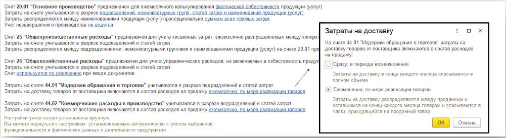 В программе всегда поддерживался способ списания затрат на доставку, соответствующий налоговому учету. В ФСБУ 5/2019 «Запасы» появился новый способ списания таких затрат. В бухгалтерском учете затраты на доставку товаров от поставщика можно включать в расходы на продажу сразу, в периоде их возникновения, без распределения между проданными товарами и товарами на складе.