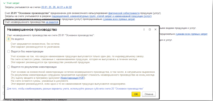 В «1С:Бухгалтерия предприятия», ред. 3.0 появилась возможность учитывать стоимость незавершенного производства с детализацией до наименования продукции. Такой учет затрат применяется, если продукция производится по индивидуальным заказам и прямые затраты на ее выпуск учитываются по каждому наименованию. Для такого учета необходимо выбрать настройку, что учет незавершенного производства ведется без инвентаризации.
