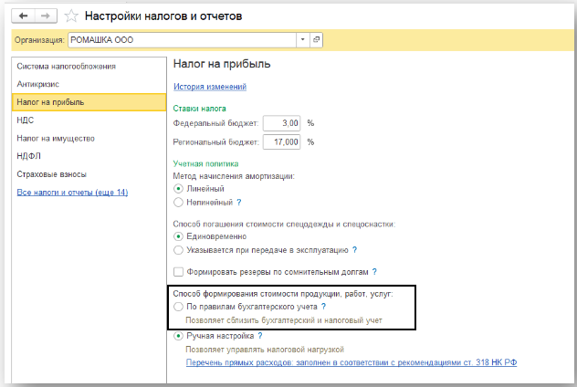Появилась возможность быстро настроить перечень прямых расходов для налогового учета по налогу на прибыль по правилам бухгалтерского учета.