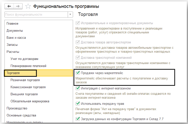 Включить продажу товаров через маркетплейсы можно из раздела «Главное» – «Функциональность» – «Торговля» – «Продажи через маркетплейс».