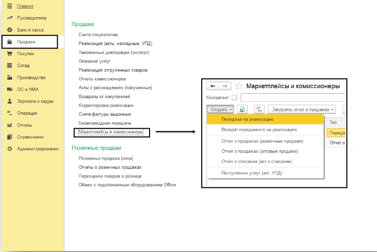 Для того чтобы создать документы, которые связаны с продажей через маркетплейсы, необходимо перейти в меню «Продажи» и выбрать ссылку «Маркетплейсы и комиссионеры».
