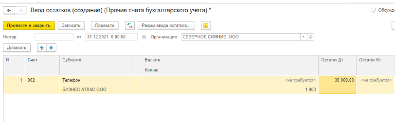 Далее проваливаемся в счет и создаем ввод остатка. Необходимо заполнить следующие данные: