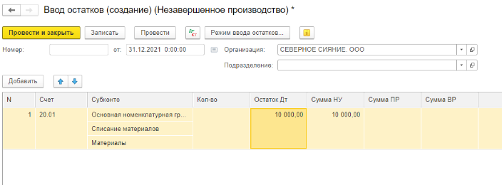 Ввод начальных остатков по незавершенному производству