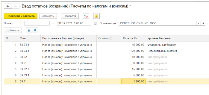 Ввод начальных остатков по налогам и взносам, которые учитываются на счете 68 или 69