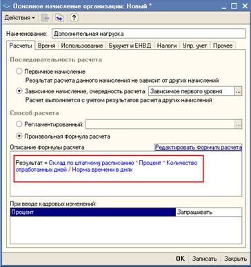 Описание: Если в произвольной формуле вида расчета используется предопределенный показатель "Тарифная ставка" (часовая, дневная или месячная) и ставка изменяется в течение месяца, то при заполнении документа "Начисление зарплаты сотрудникам организаций" в обеих строках по такому виду расчета проставляется значение, действующее на конец месяца.